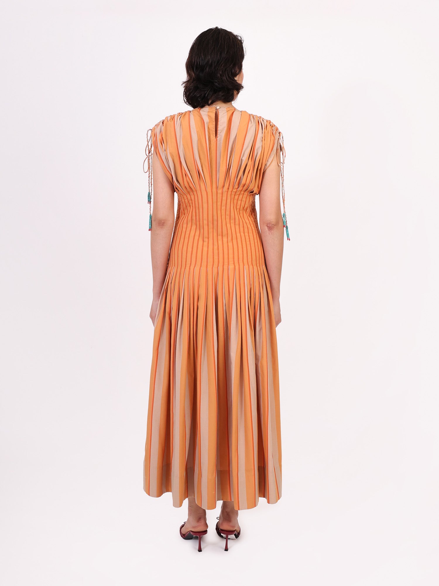 This dress is a celebration of craftsmanship and movement. The bodice is detailed with fine pintucks at the waist that release into a softly flared, flowy bottom, creating an elegant sense of ease. The adjustable shoulder ties are finished with delicate beading and tassel details, adding a subtle artisanal touch.