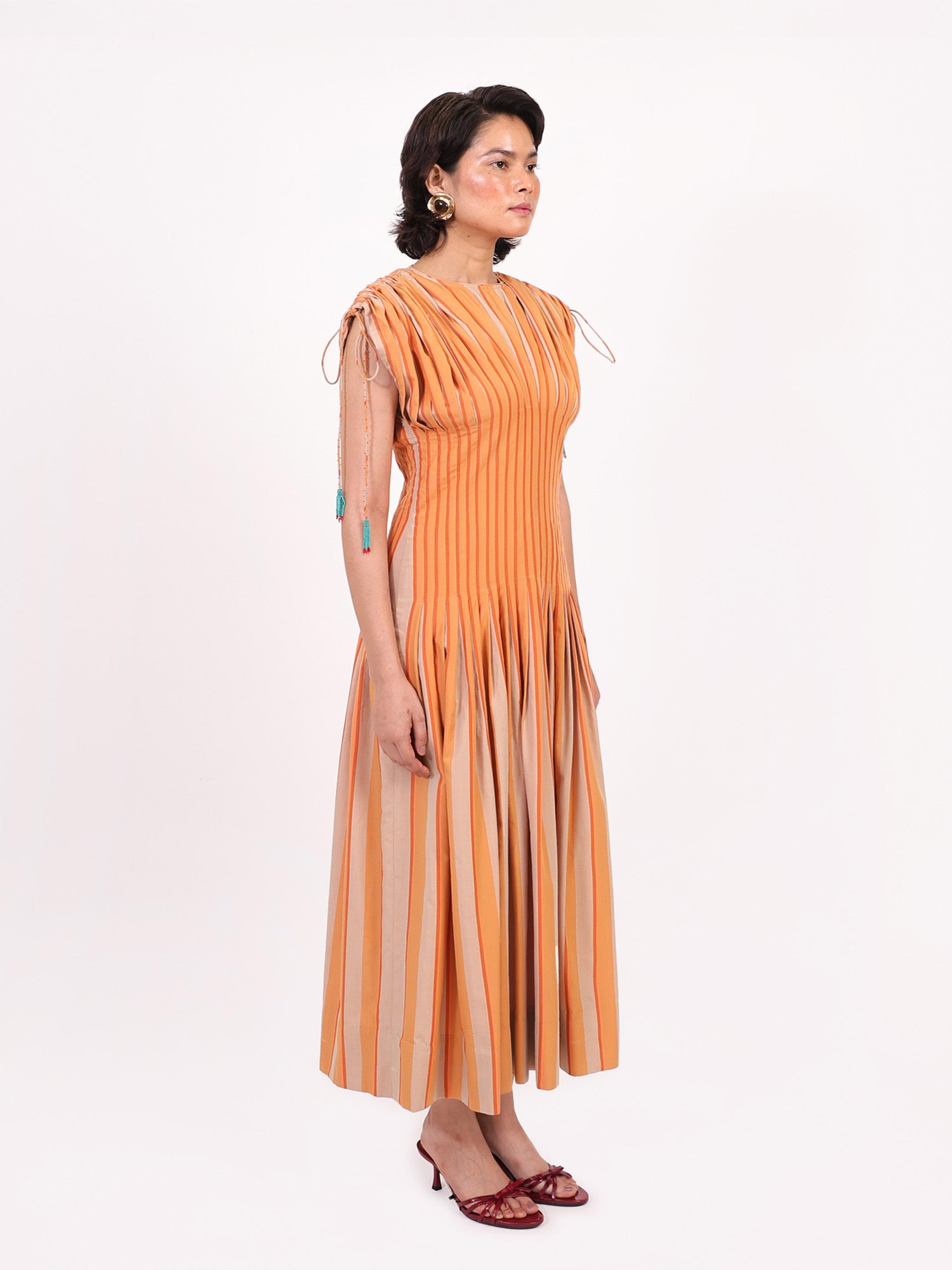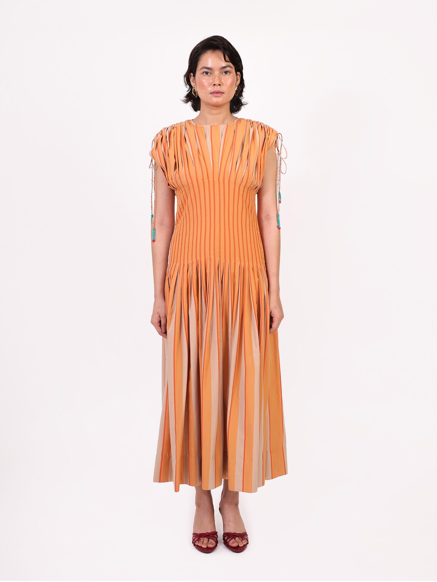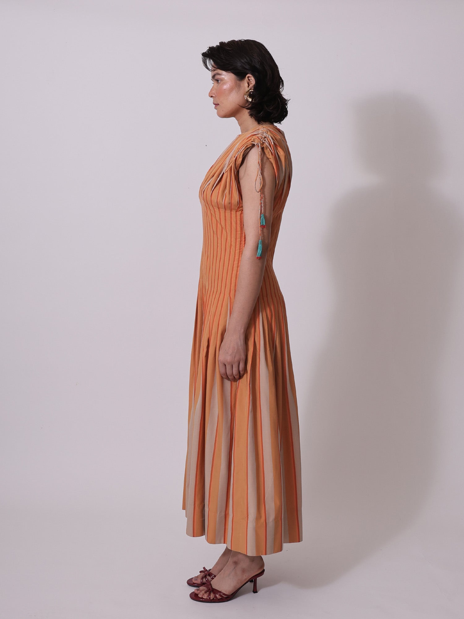 Designed in a warm sunset hues, this dress is perfect for occasions that call for understated sophistication, from sunset gatherings to evening soirees.