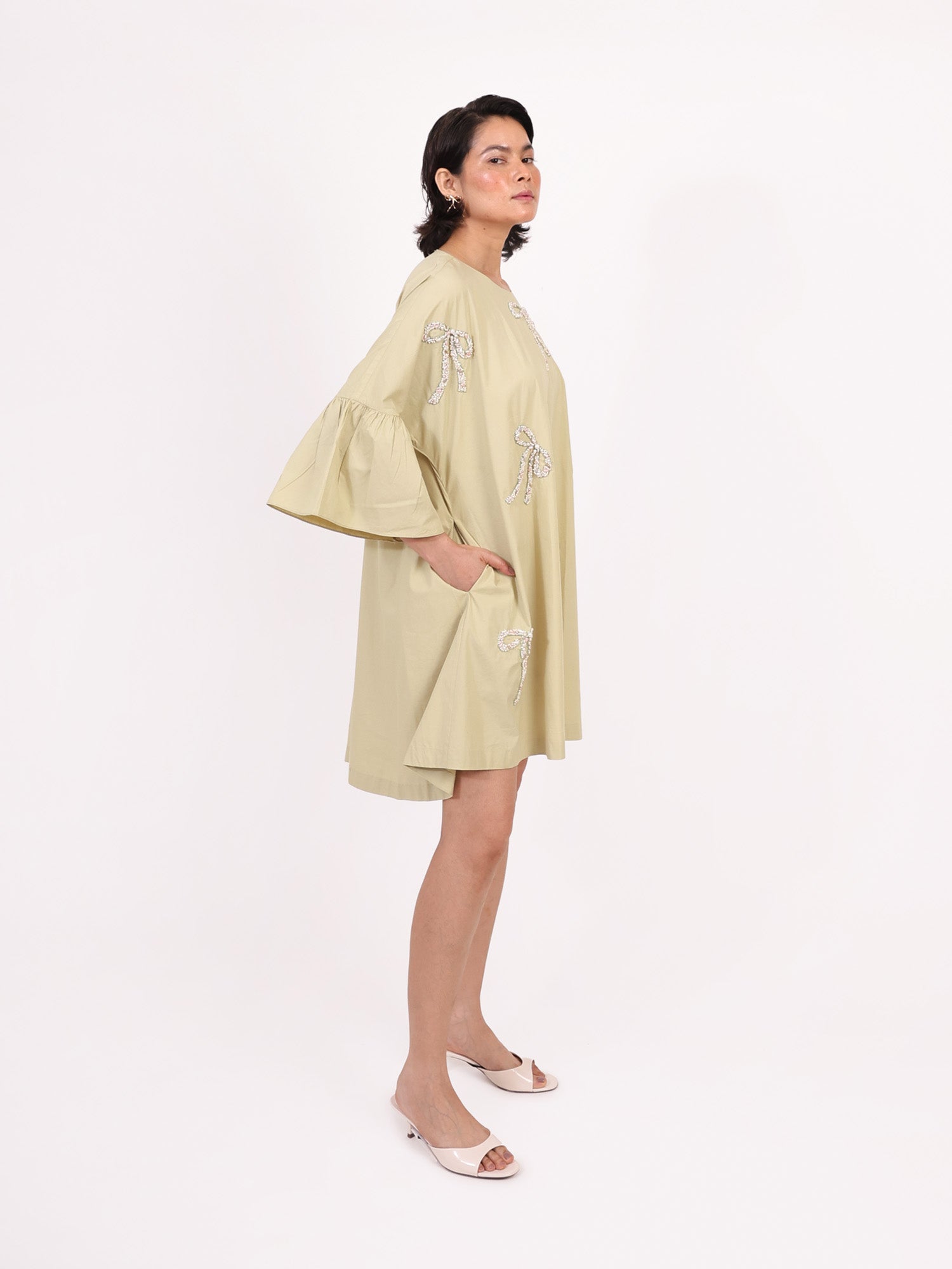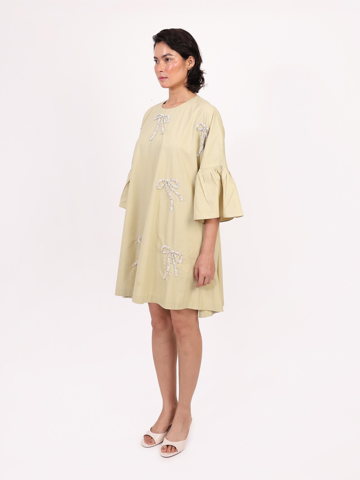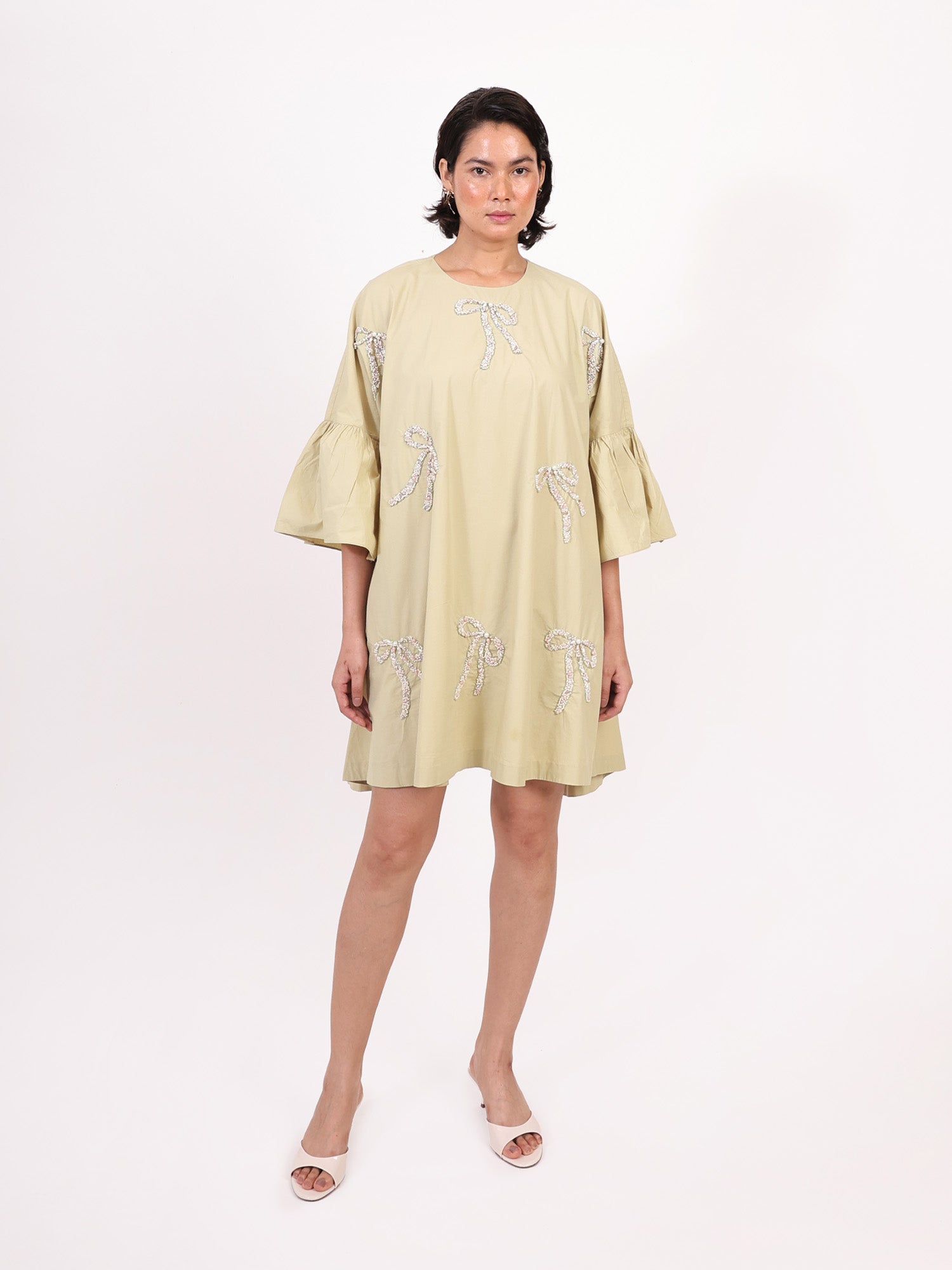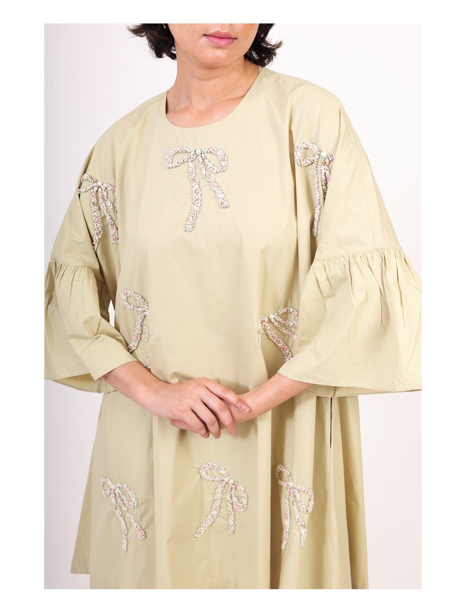 This mint-hued dress is designed with a universally flattering free-size silhouette, making it as easy to wear as it is beautiful. Adorned with scattered hand-embroidered bows, it carries a touch of whimsy while staying effortlessly chic. Its relaxed shape drapes gracefully on every body type, from petite to plus-size, making it a versatile piece for sunny days and casual evenings alike.