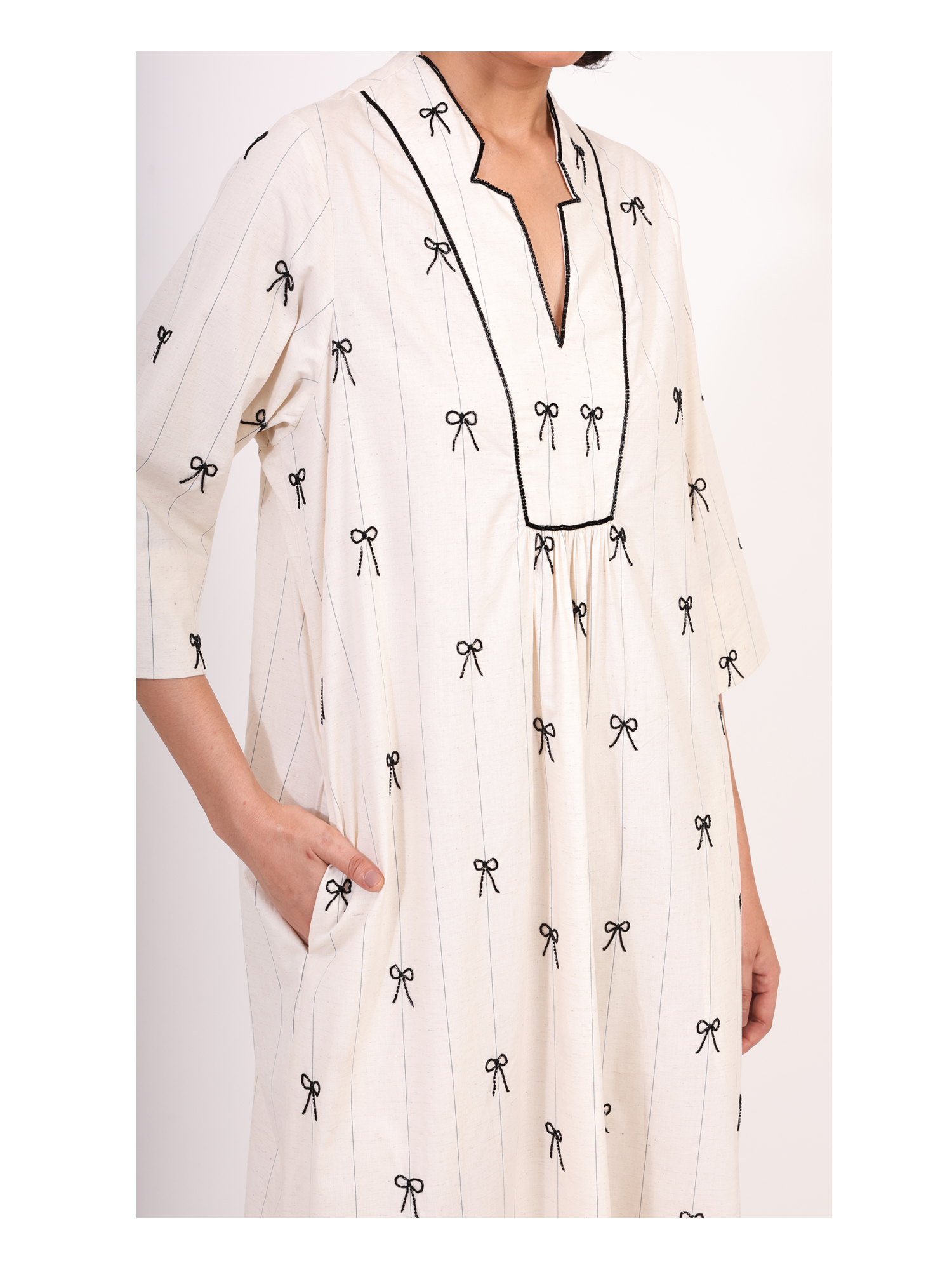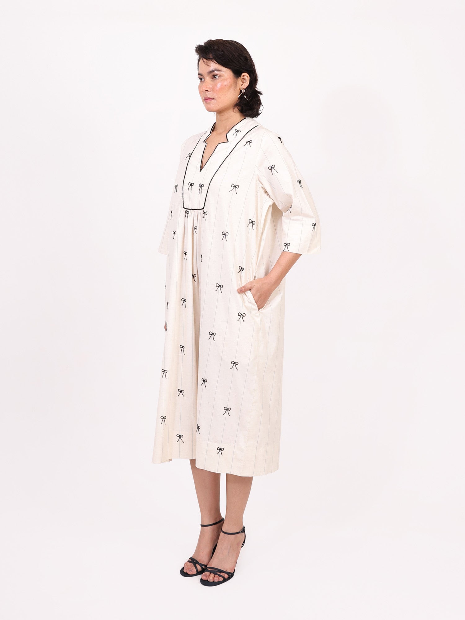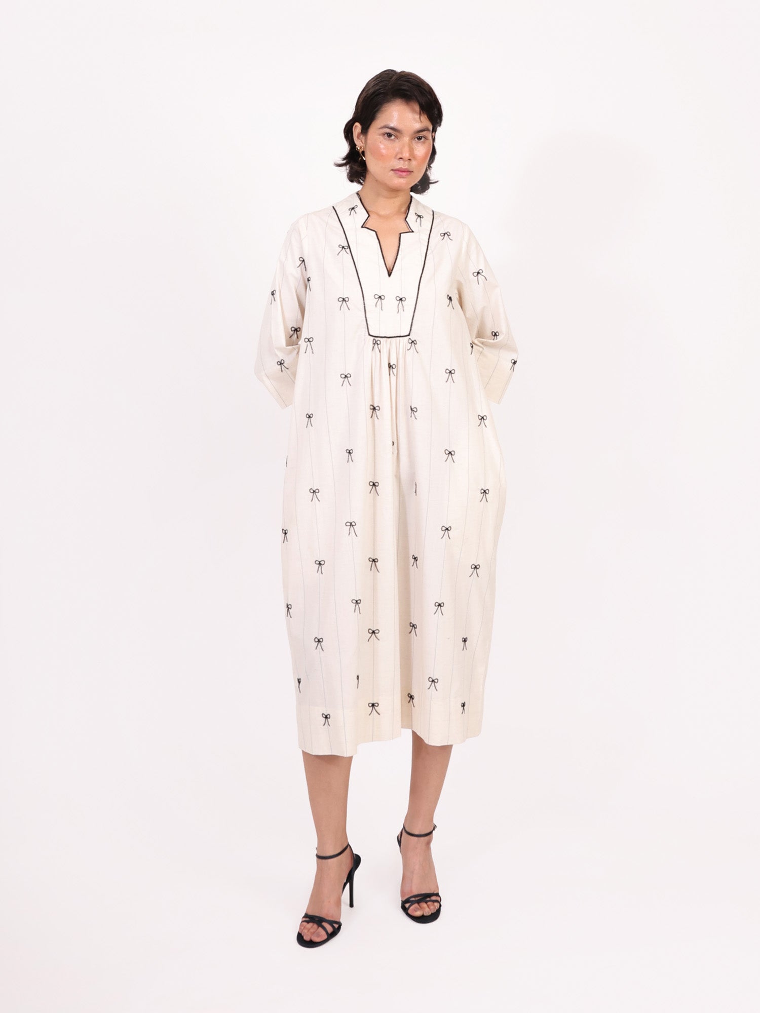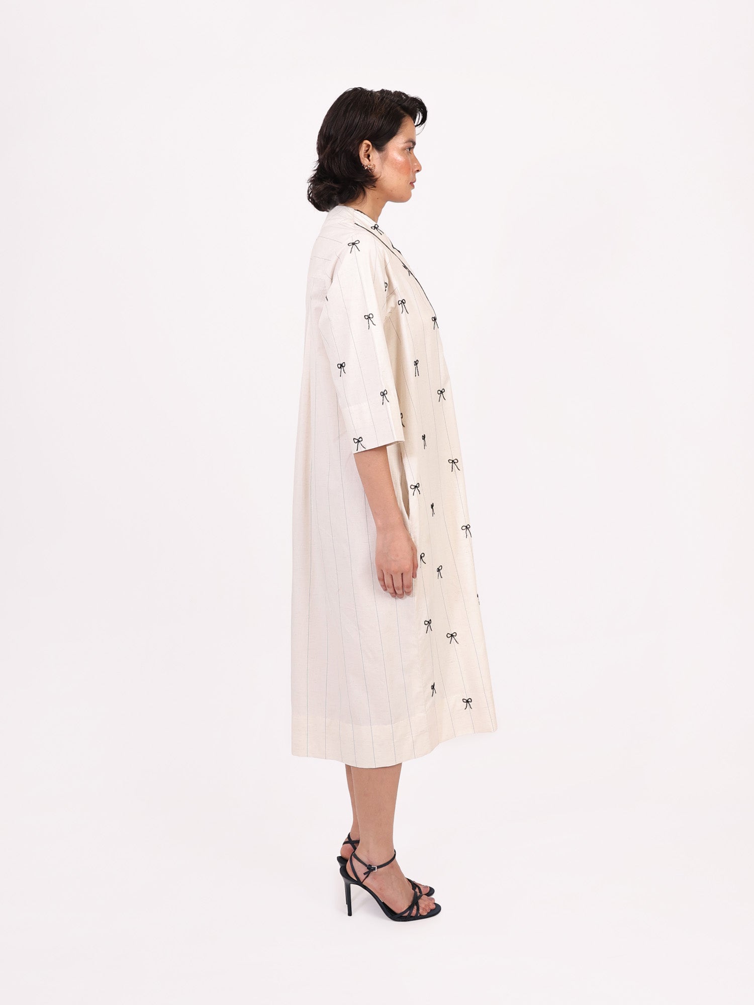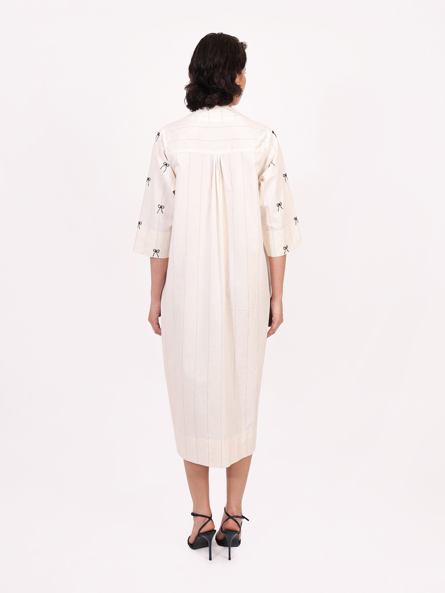 Minimal and poetic, this ivory dress with pinstripes is adorned with hand-embroidered bows scattered across its soft cotton canvas. Its relaxed and understated fit, and contrast neckline detailing make it an easy piece for quiet moments or curated gatherings.