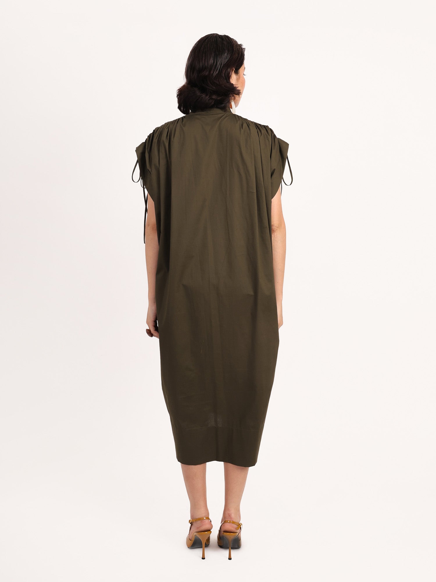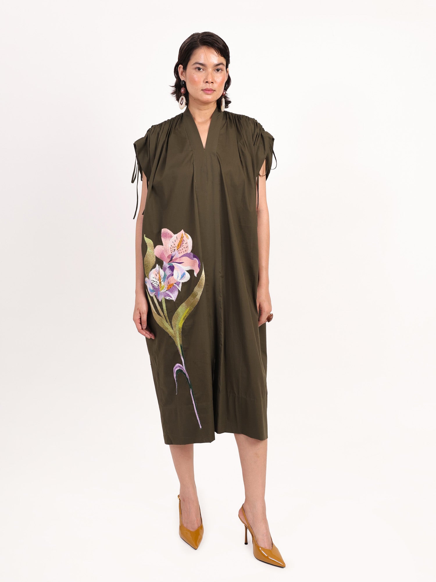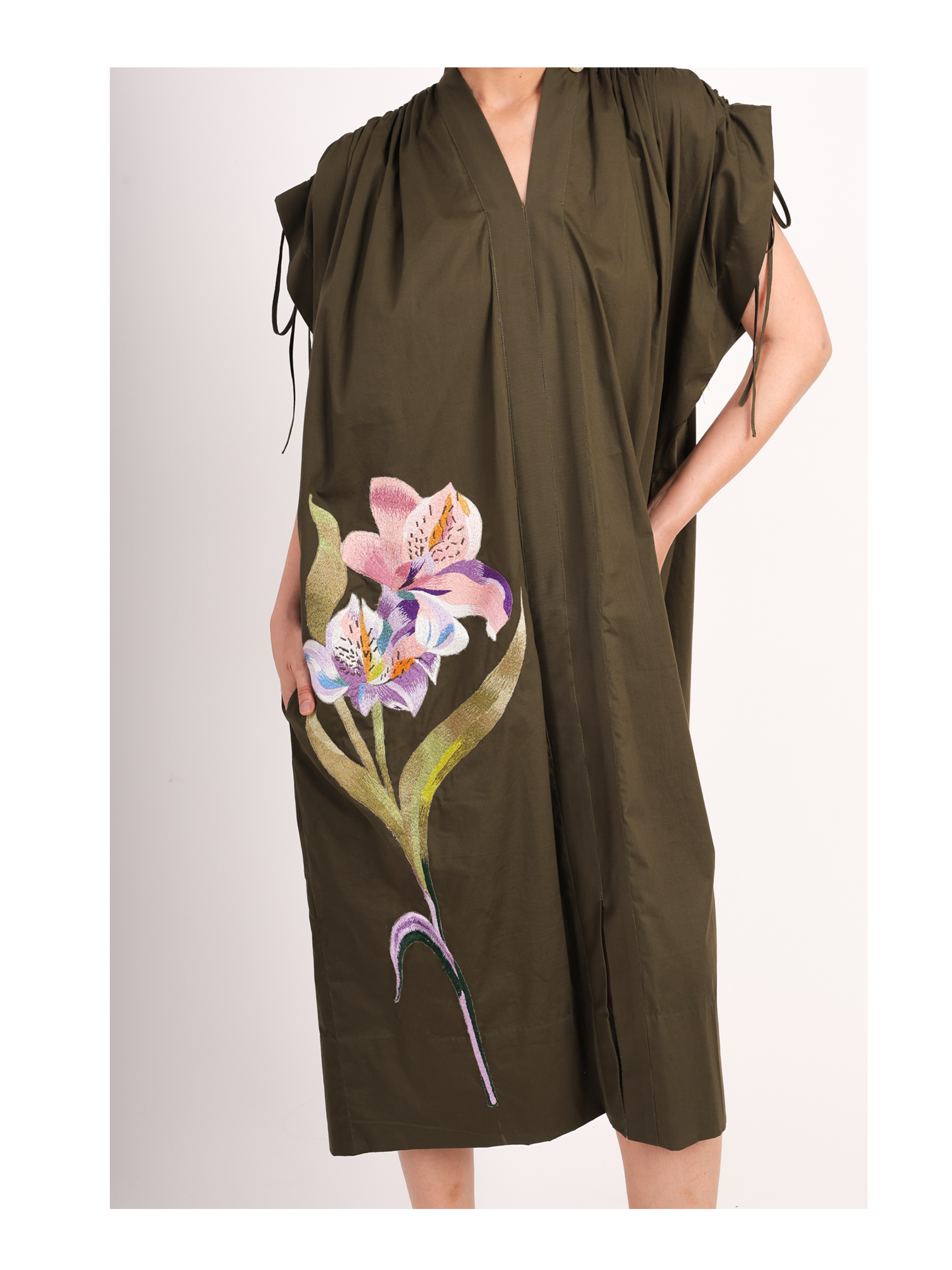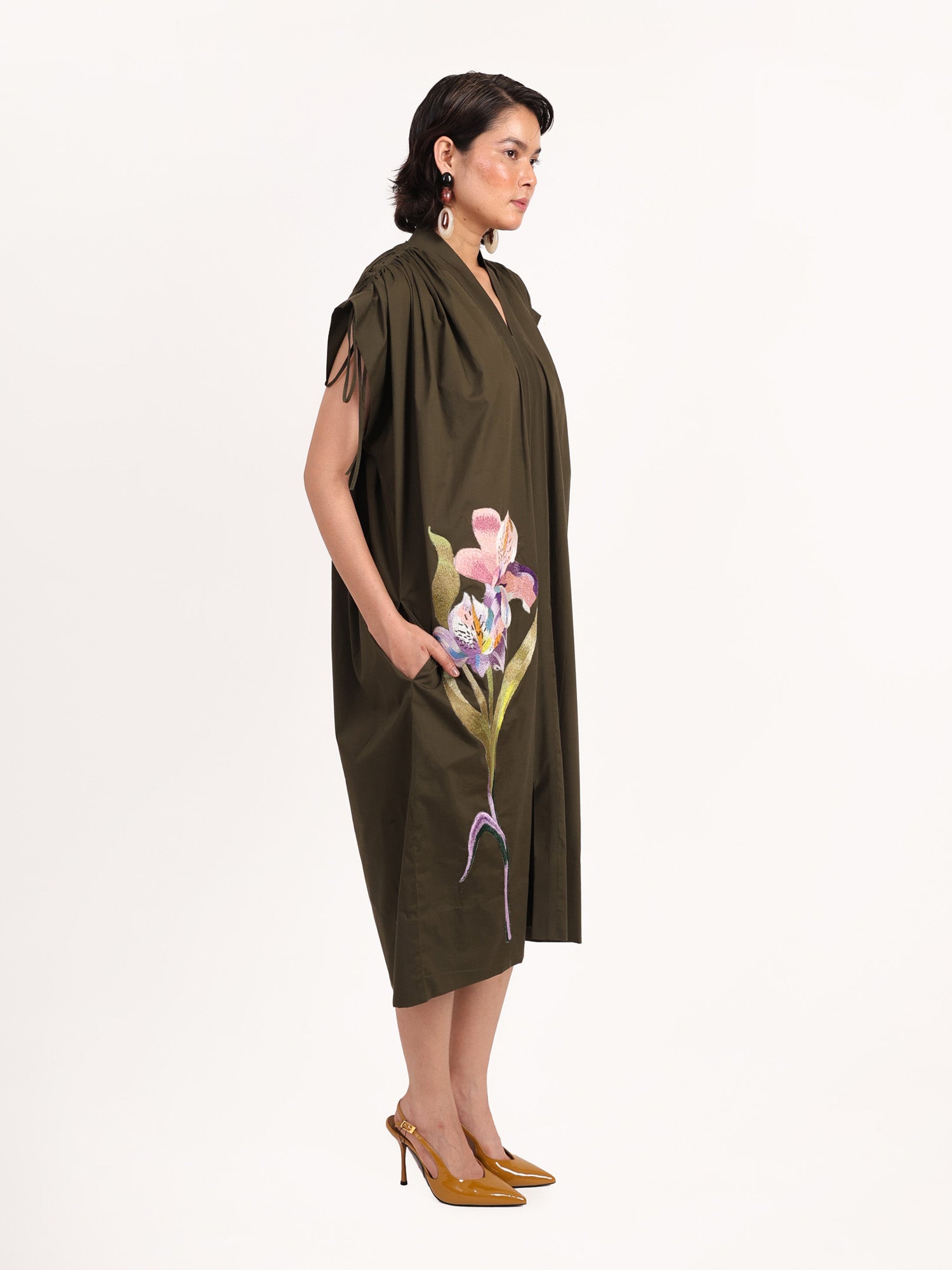 This olive kaftan dress is a wearable work of art. Embroidered with an oversized floral motif created with silk threads, it turns everyday dressing into a statement. The relaxed silhouette and soft cotton fabric make it as comfortable as it is elevated.