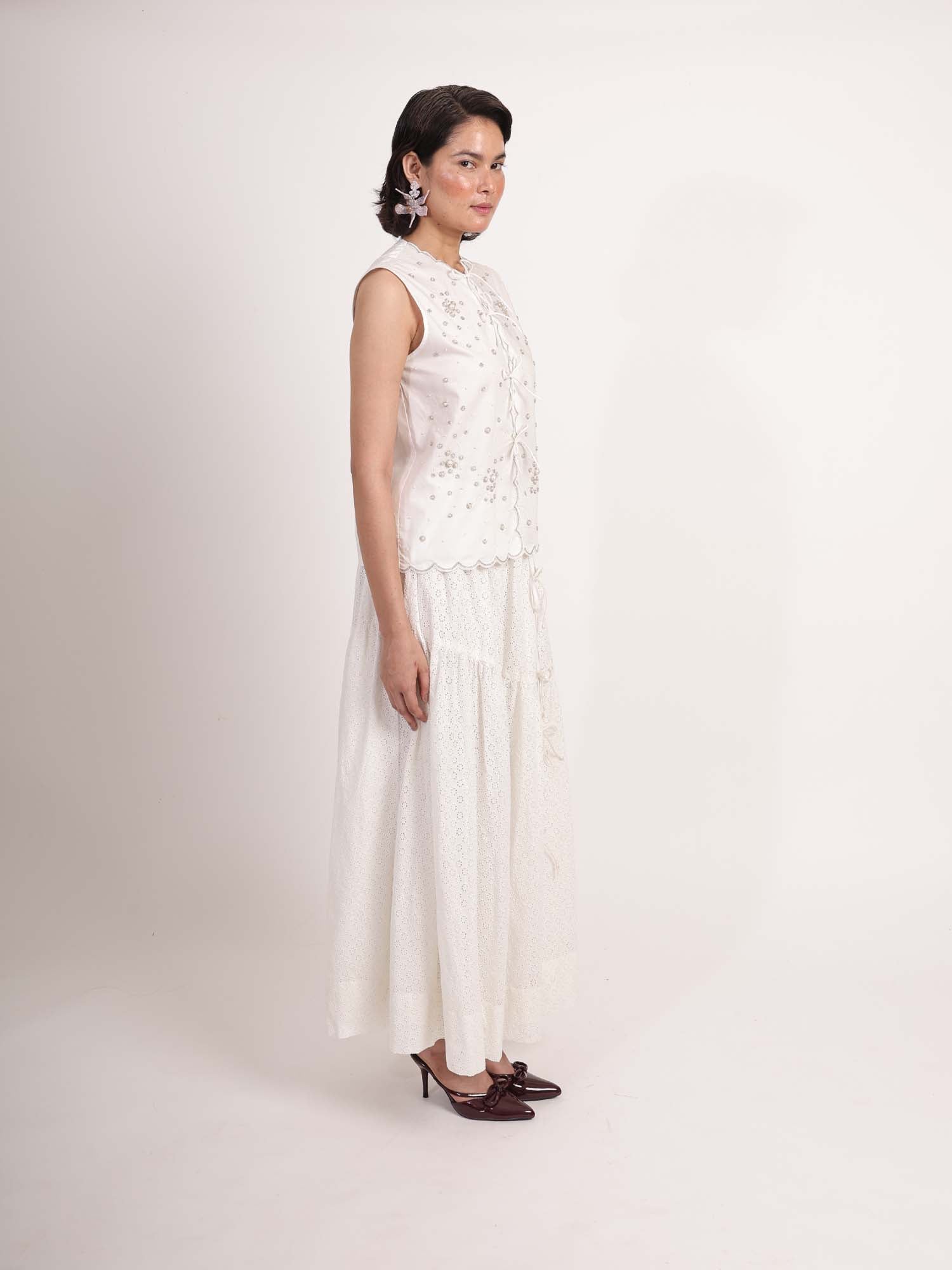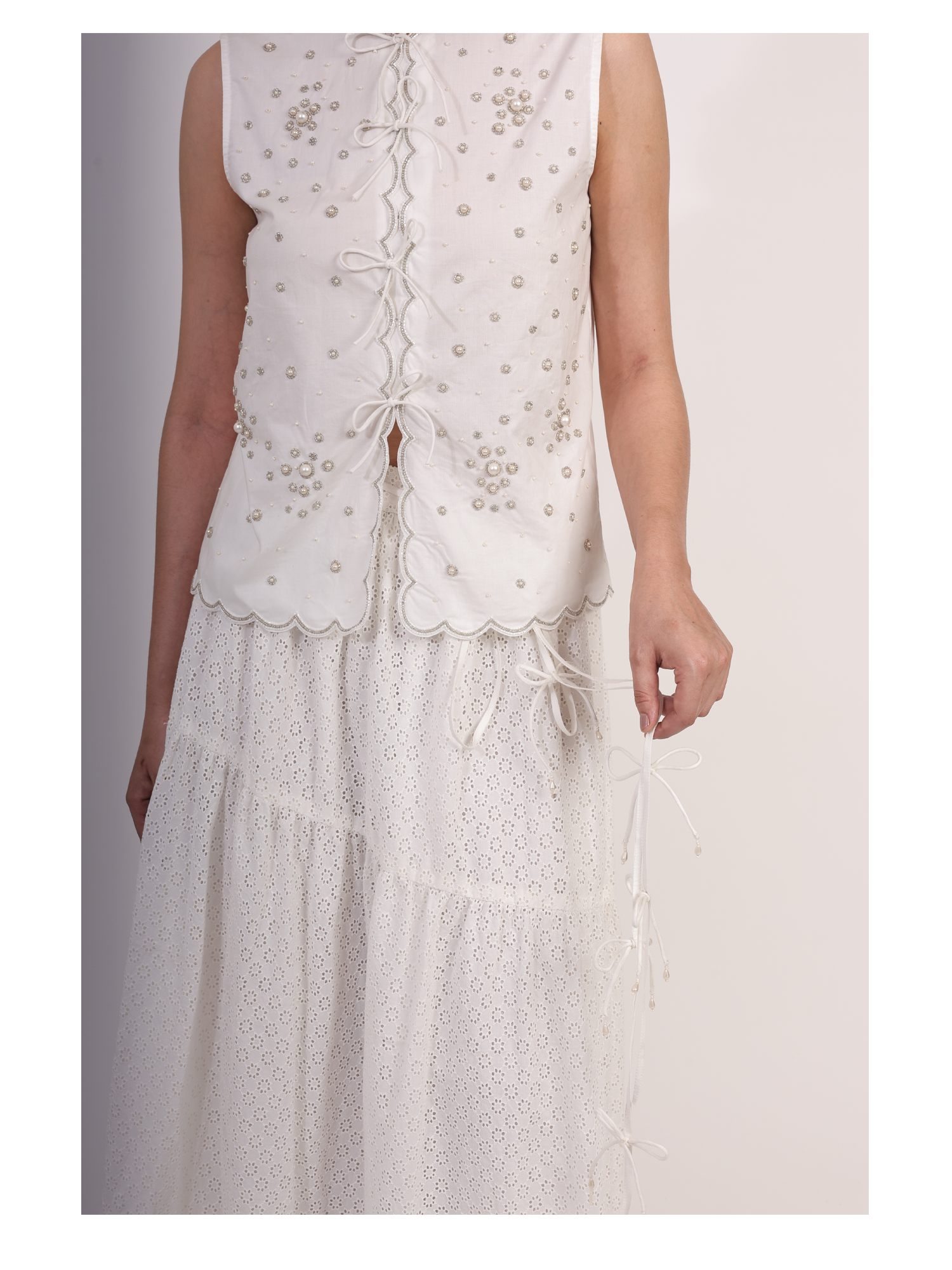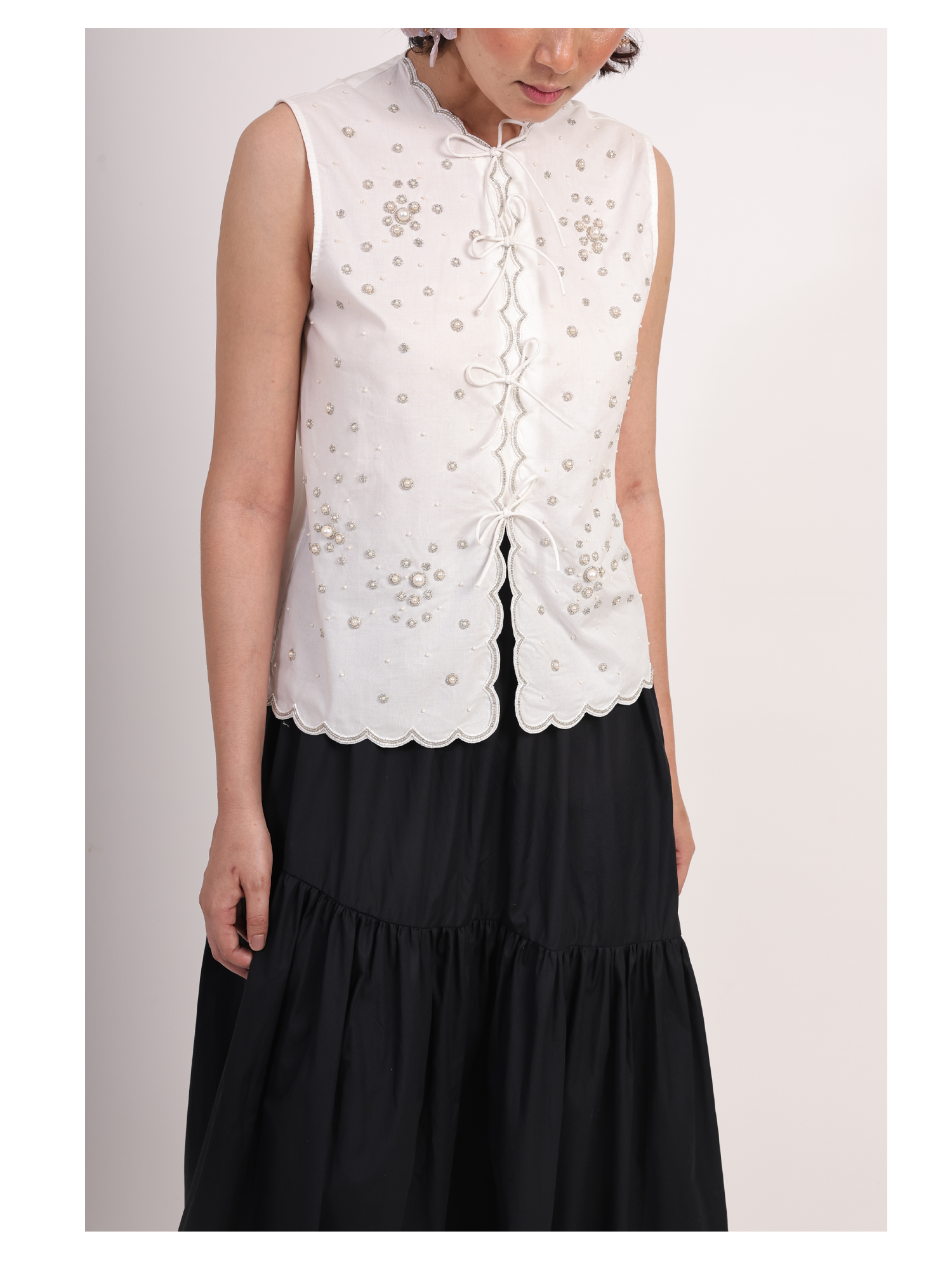 It features intricate hand embroidery and a delicate tie-front closure with scalloped edges, it creates a subtle tone-on-tone texture that feels both modern and timeless. The tie-front detail is decorative, adding a soft, feminine finish without adjusting the fit.